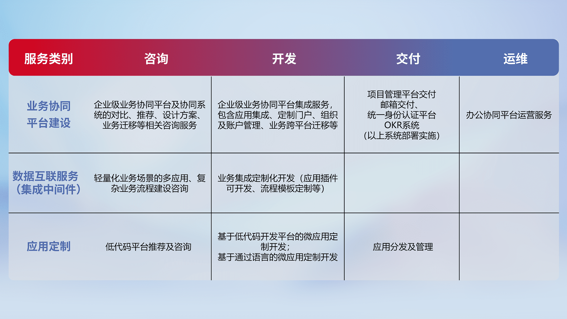 针对钉钉、、企微、、、、IDaas等平台级产品提供产品的规划、、方案、、、、交付、、、、定制化开发等服务,,,,实现如统一协同办公、、、、智能客户服务、、混合会议管理、、智能数据查询、、、等业务场景,,实现数字化转型。。